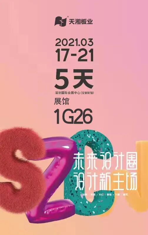 2021年3月17日-21日深圳时尚家居设计周暨36届深圳国际家具展览会在深圳国际会展中心1号馆举行,为期五天,应时下潮流趋势,天湘将展出公司创新研发成果SG系列产品(设计高端系列),SG系列产品为国内首款采用EB技术(民用核工业技术)的饰面板材,具有环保,硬度高,色牢度高,光感效果肤感效果好等优越性能,SG系列色彩纯正,花色丰富;欢迎各界新老好友关注支持,莅临展位交流品鉴。