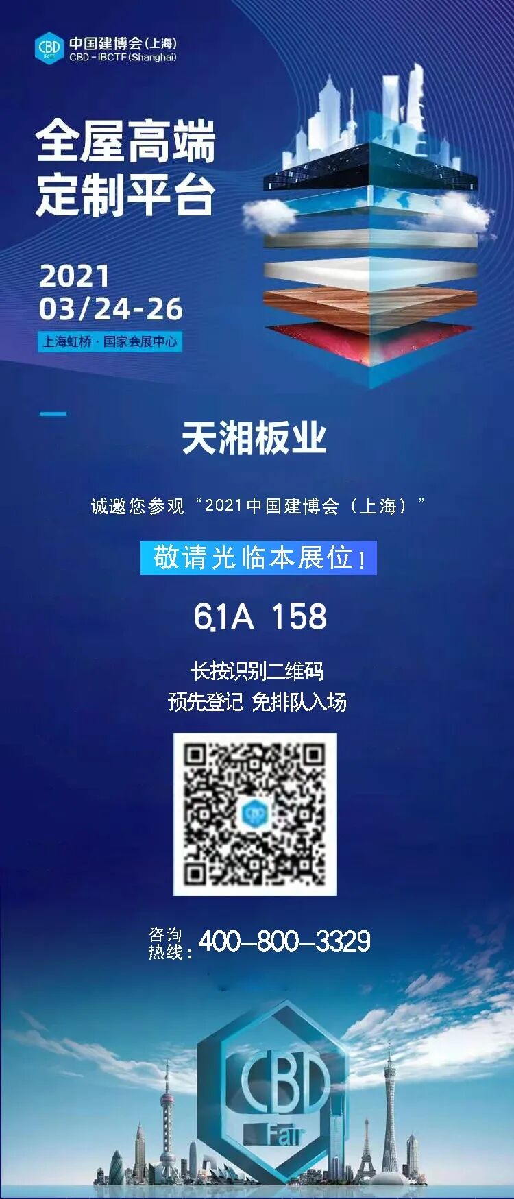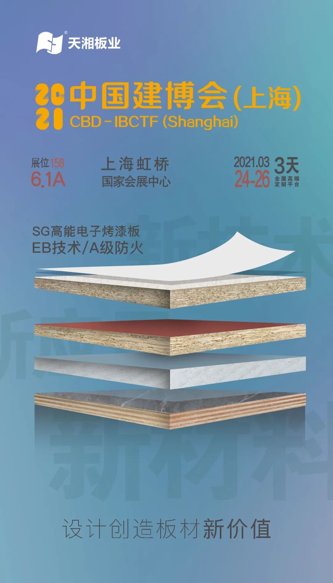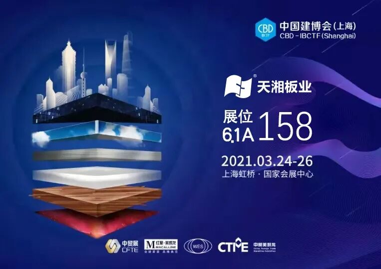 3月24日-26日,上海虹桥 · 国家会展中心(6.1A158)展位,天湘板业与您相约在阳春三月,春暖花开时,敬候您的到来。现扫在打开上方小程序提前预约登记入场,免排队入场哦。