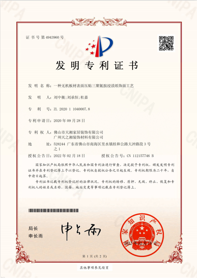 春风送喜,2022年天湘板业首个荣誉——由国家知识产权局审核的“一种无机板材表面压贴三聚氰胺浸渍纸饰面工艺”发明专利申请成功啦!天湘板业原晶板表面压贴三聚氰胺浸渍纸饰面工艺专利的通过,同时实现了三聚氰胺饰面技术在无机材料上压贴成功的行业突破!