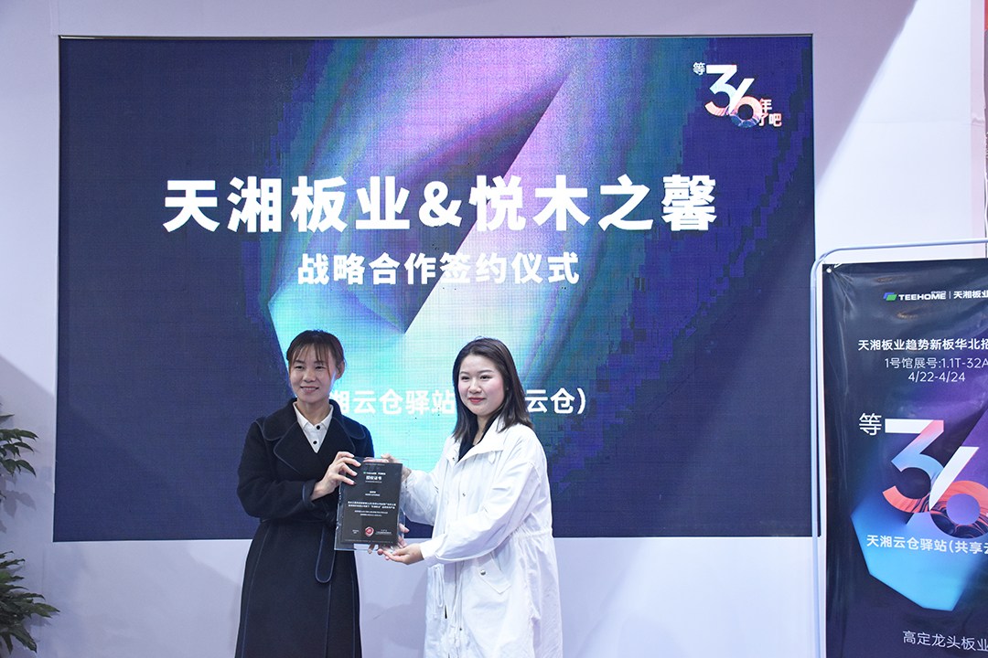 这一次,天湘板业来到华北,上线华北共享云仓。招商会现场,天湘板业与悦木之馨举行签约仪式,正式达成战略合作,悦木之馨将作为天湘板业在华北市场的优秀大商,负责天湘板材在山东,河南,山西,安徽,河北,天津,北京多地的运营,依托悦木之馨的强大实力和号召力,将加速天湘品牌进驻华北大市场。