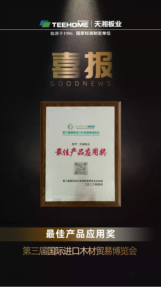 在本届木博会大会期间,天湘板业荣获“2023第三届国际进口木材贸易博览会金牌参展商”和“2023第三届国际进口木材贸易博览会最佳产品应用奖”。天湘板业擅长应用还原的技术把美丽的自然元素还原到人造饰面板上。平均每年研发超500个新花色,日均生产逾40000张板,本次展会天湘品牌再获肯定。