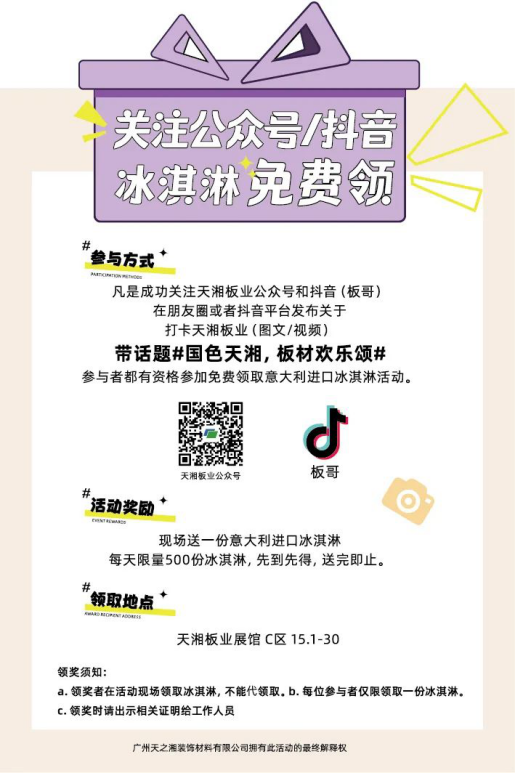 在展会现场的观众仍旧可以参加扫码关注板哥抖音账号并且发布带话题#国色天湘,板材欢乐颂#图文&视频即可品尝意大利进口冰淇淋~首日活动吸引了很多大小朋友前来打卡,数量有限,想体验冰淇淋的朋友们每天先到先得!