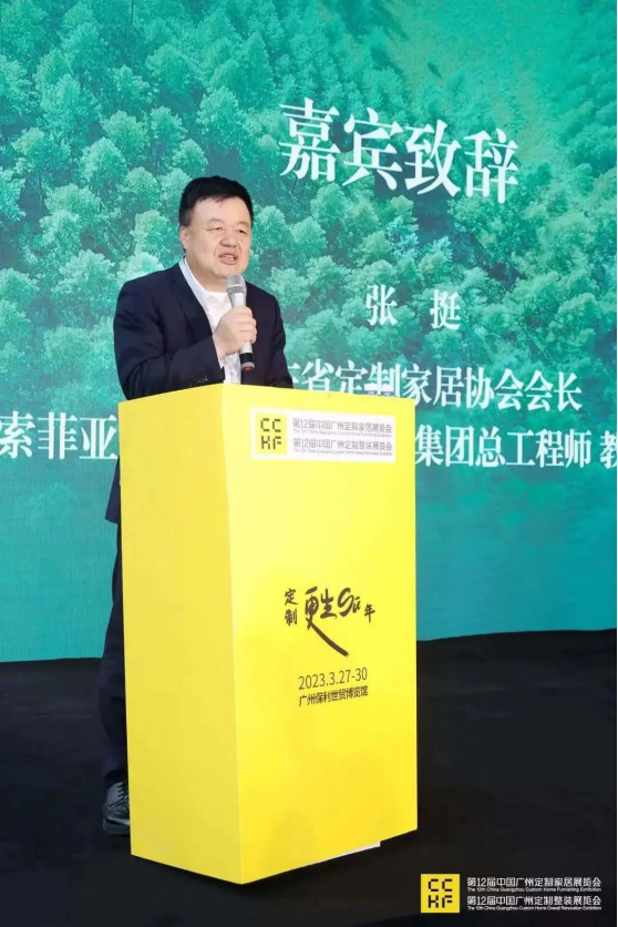 广东省定制家居协会会长、索菲亚家居股份有限公司集团总工程师张挺在致辞中指出,可饰面定向刨花板解决了OSB直接饰面应用的问题,满足了定制家居产品高效生产应用的需求,被市场接受并应用于板式家具、木门、地板等木制品的生产,祝贺获得推荐入选的领军品牌企业,希望通过全行业的共同努力,推动人造板行业、定制家居行业可持续高质量发展。