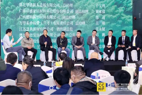 行业高质量发展论坛环节,湖北华盛新总经理于宝利、万华生态板业(兰考)总经理吴刚、宁丰集团研究院院长吴方镜、派阳山副总经理黄家福、澳思柏恩销售总监彭鹏、茂友木材生产经理张志强、德科康材销售副总经理苏通、慧典新材销售副总张永健共同围绕可饰面定向刨花板领军品牌企业如何走好高质量发展之路、维护品牌形象,如何在高定、整家定制和门墙柜一体化等议题展开深入探讨,现场嘉宾各抒己见,干货满满。