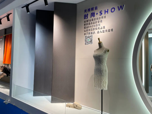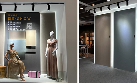 本次展会天湘以“家居·印象”为主题,集中展示电子烤漆、金砂极简、蕾丝SHOW、摩尔纹影木、仿生小牛皮,混油半透之外。还有神秘新品穿插其中,据天湘研发人员介绍,因其卓越的饰面效果,被客户强烈要求提前亮相,答案我们下次揭晓。