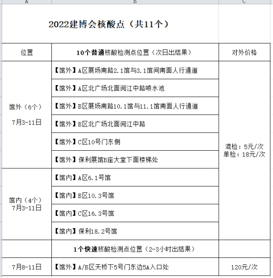 根据建博会最新防疫要求,低风险区人员入场均需持24小时核酸阴性证明入场,展会观众入场时间为9:00——17:00,请参会的朋友合理安排时间提前登记身份信息及进行核酸检测。