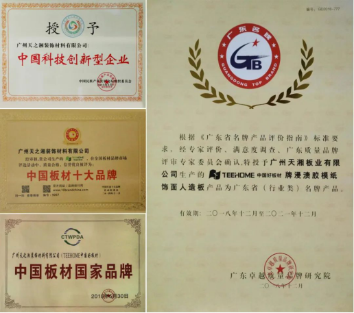 二十年一路创新奋进,天湘集团已发展成为一家拥有六家子公司的优秀企业,客户遍及全球。天湘是全国人造板标准化技术委员会单位会员,参与行业多项板材标准制订,其中有《无醛人造板及其制品》标准和住建部的《木质挂板通用技术条件》标准等。凭借着创新的产品,高标准的要求及良好的信誉,一度受邀参加《CCTV影响力对话栏目》,产品在行业内获得一致好评,荣获《中国科技型创新企业》、《中国十大品牌》,《中国板材国家品牌》,《广东省名牌产品企业》等诸多殊荣,用20年的品质坚持,换来全行业的认可和“中国好板材”的荣光。