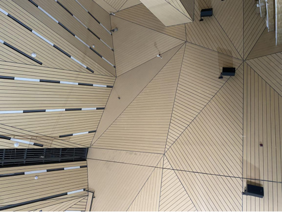雄安完全中学项目报告厅采用定制尺寸原晶板铺就整个墙面天花魔幻造型