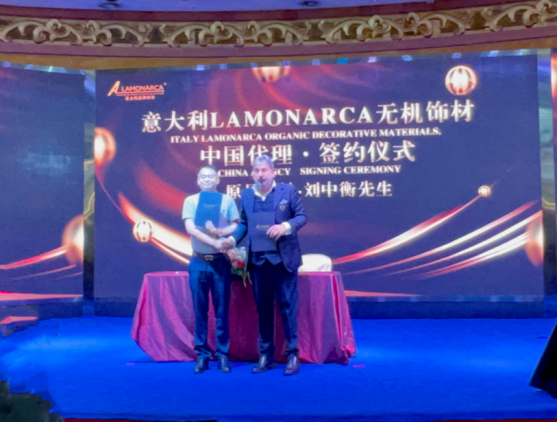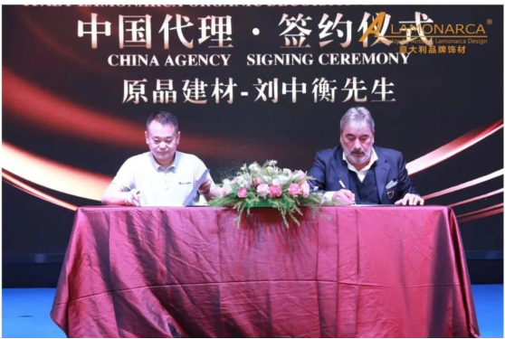 近日,总部设在意大利米兰VIA D0N BARTOLOMEO GRAIOLI,47、由首席执行官兼创始人、建筑师ANTOIO LAMONARCA代表LAMONARCA公司,和总部设在广州(中国)的空间板材品牌原晶建材达成中国代理无机饰材合作,举行签约仪式。广东原晶空间建材有限公司创始人刘中衡与LAMONARCA公司首席执行官兼创始人、建筑师ANTOIO LAMONARCA代表双方在合作协议上签字。