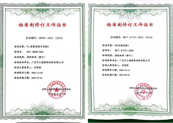 天湘板业获得《GB/T 41715—2022 定向刨花板》和《GB/T 28995—2022人造板饰面专用纸》国家标准制修订工作证书。 作为人造板行业的绿色理念先行者这是天湘板业本年度继参与《基于极限甲醛释放量的人造板室内承载限量指南》和《人造板及其制品气味分级及其评价方法》两项标准制修订工作之后,天湘板业又参与的新一轮国家人造板行业标准的制修订。