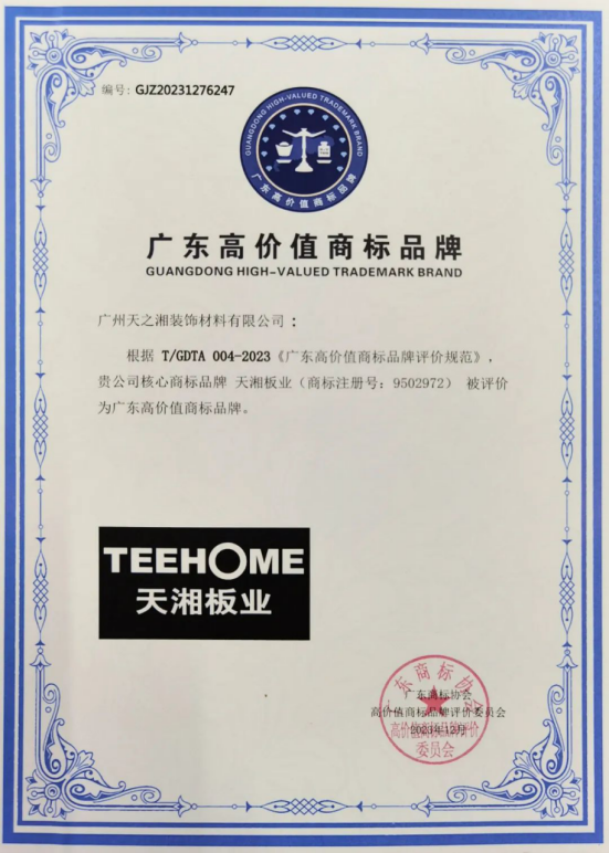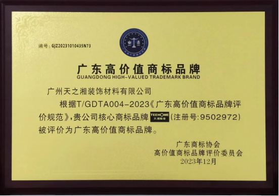 近日,依据团体标准《广东高价值商标品牌评价规范》(T/GDTA004-2023),经广东商标协会高价值商标品牌评价委员会审议通过,2023年广东省家具行业高价值商标品牌榜单发布。天湘板业获“广东省高价值商标品牌”称号。